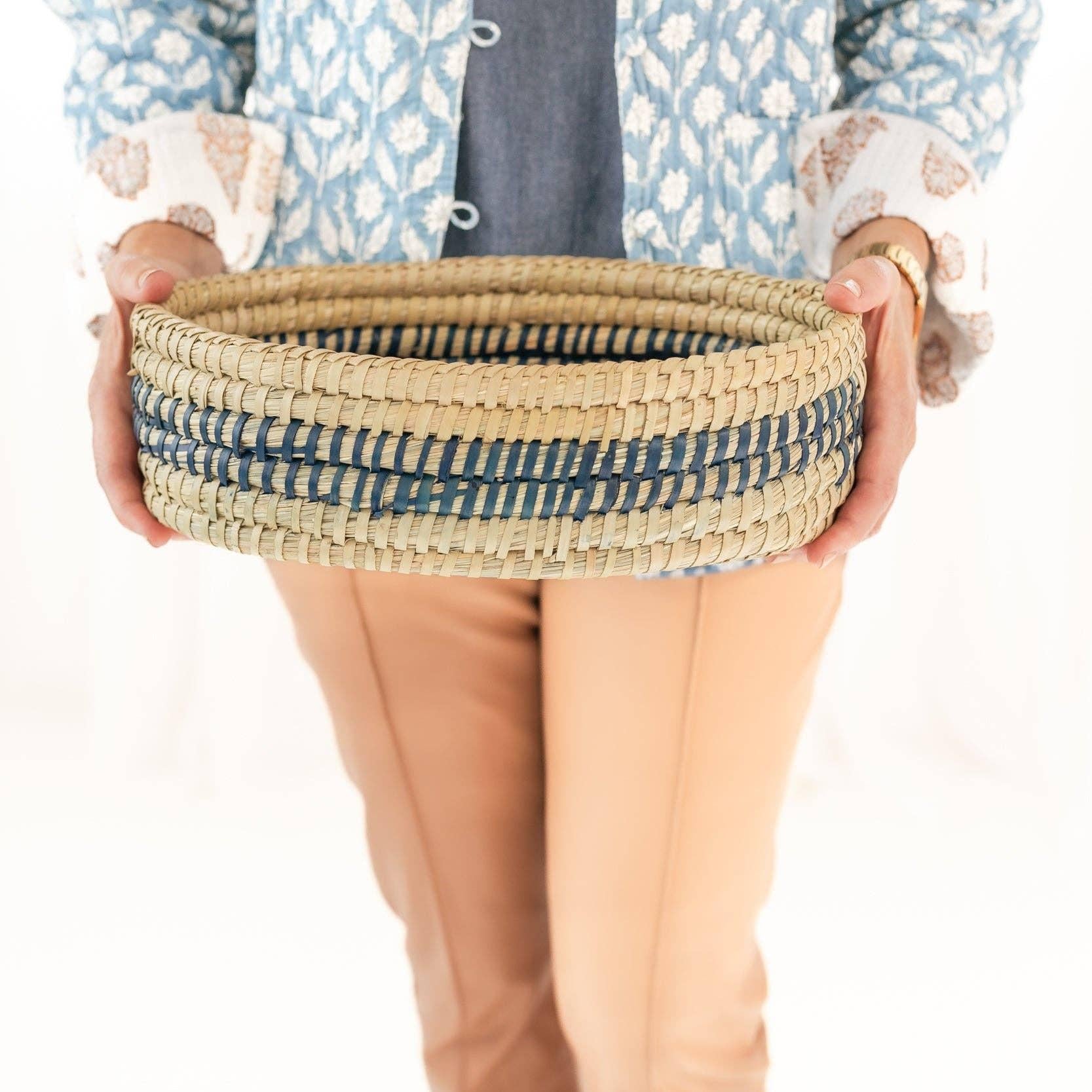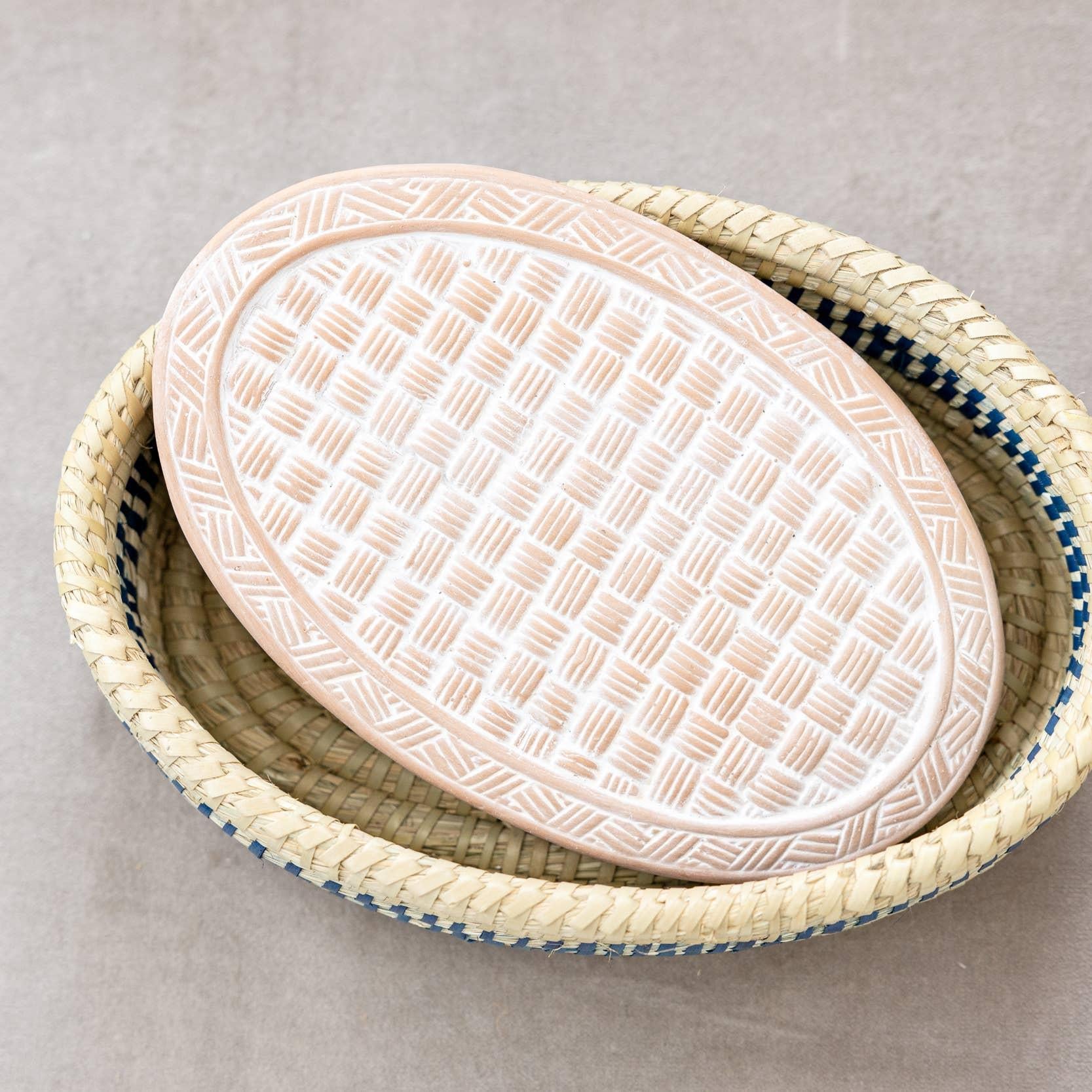 Sustainable Materials:Whitewashed terracotta stone & kaisa grass basket. Fair Trade: Women artisans receive a fair, living wage for their work.