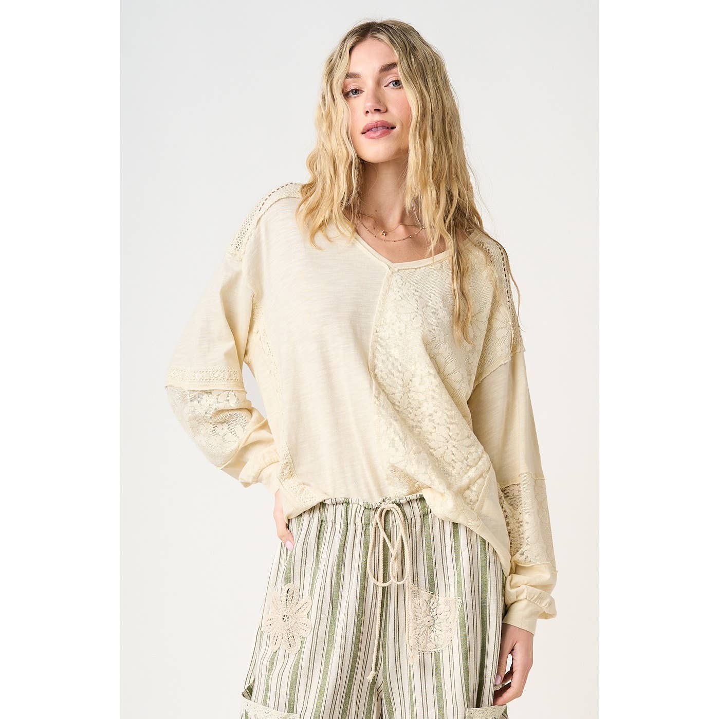 Floral and geometric lace detail. Contrast panel on body and sides.