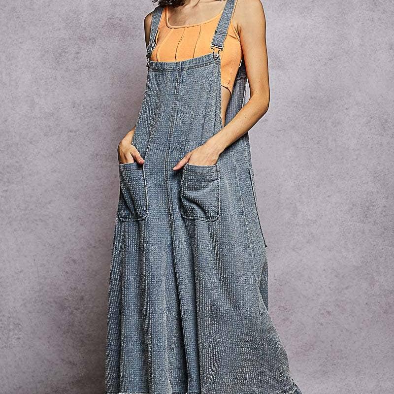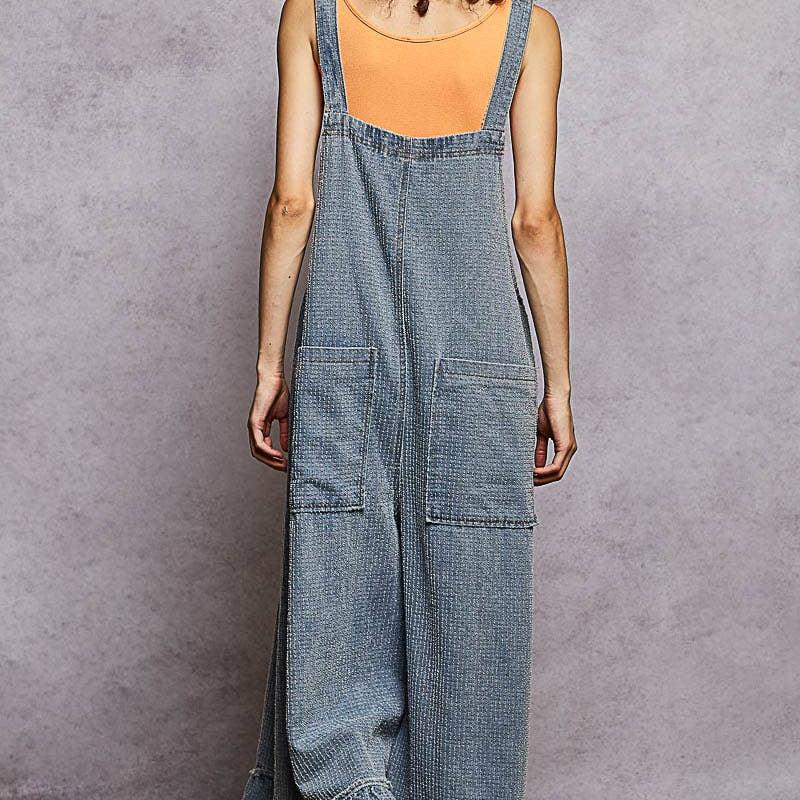Designed in roomy fit overalls in textured denim with contrast ruffled hem accents and dual patch pocket detail.